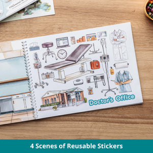 The All Around Town Reusable Sticker Book includes reusable stickers and scene pages that enhance creativity and storytelling to encourage interactive learning.